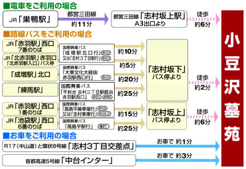 小豆沢墓苑の最寄り駅の都営三田線「志村坂上」は、大手町から直通24分。巣鴨駅から直通11分。